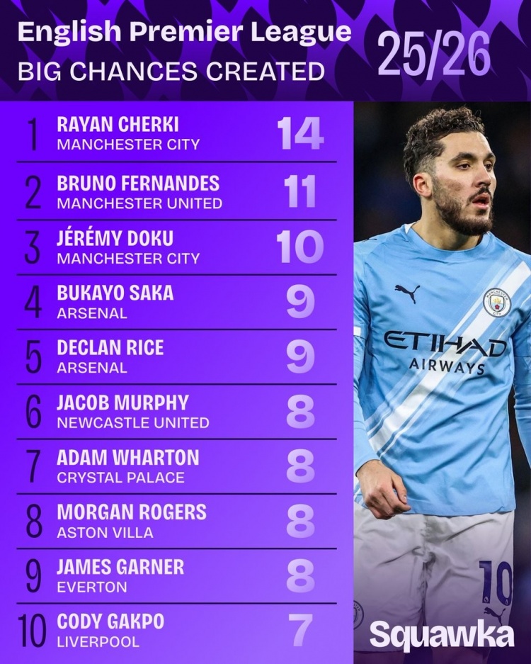 本赛季英超创造重大机会榜: